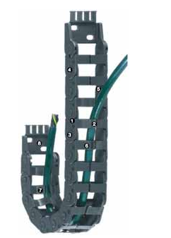 Z 14系列 - 鏈, 從外徑方向 1. 可進(jìn)行扭轉(zhuǎn)運(yùn)動 2. 非常易于填充——適合預(yù)裝配插頭的應(yīng)用 3. “按鈕式設(shè)計”將鏈節(jié)固定在一起 4. 小節(jié)距實(shí)現(xiàn)靜音平穩(wěn)的運(yùn)轉(zhuǎn) 5. 保護(hù)電纜的內(nèi)部空間 6. E型,沿外徑填充 7. Z型,沿內(nèi)徑填充 8. 可選用集成去應(yīng)力元件的安裝架 可提供內(nèi)寬 Bi: 10 - 50 mm 可提供彎曲半徑 R: 28 - 125 mm 螺距: 30,5 mm/鏈節(jié) = 33 鏈節(jié)數(shù)/米